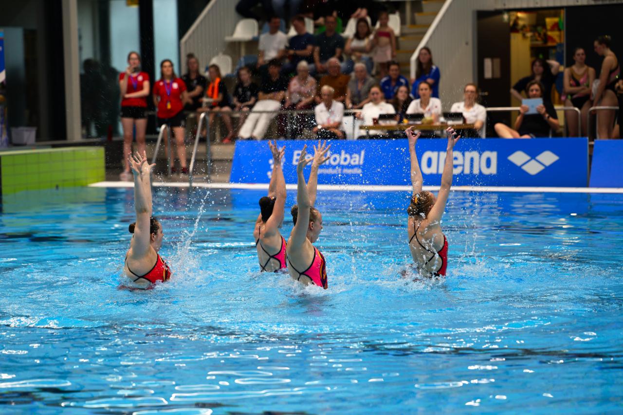 De wedstrijddag werd afgesloten met de ploeg, bestaande uit Mireille en Larissa Krist, Kyara Domingos Fidalgo en Wendy Elferink. Ook dit team trad aan in een nieuwe samenstelling. Mede dankzij de ervaringen die zijn opgedaan tijdens het NK Acro, liet de ploeg sterke opduwen zien: gecontroleerd, krachtig en met overtuiging uitgevoerd. In een sterk deelnemersveld leverde het team een nette prestatie. Daarbij is het extra noemenswaardig dat deze ploeg volledig uit juniorzwemsters bestaat, die het opnamen tegen senioren.